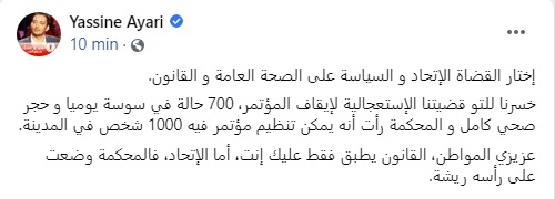 وأضافق في تدوينة نشرها على صفحته بالفايسبوك: "إختار القضاة الإتحاد و السياسة على الصحة العامة و القانون. ..700 حالة في سوسة يوميا و حجر صحي كامل و المحكمة رأت أنه يمكن تنظيم مؤتمر فيه 1000 شخص في المدينة... عزيزي المواطن، القانون يطبق فقط عليك إنت، أما الإتحاد، فالمحكمة وضعت على رأسه ريشة".