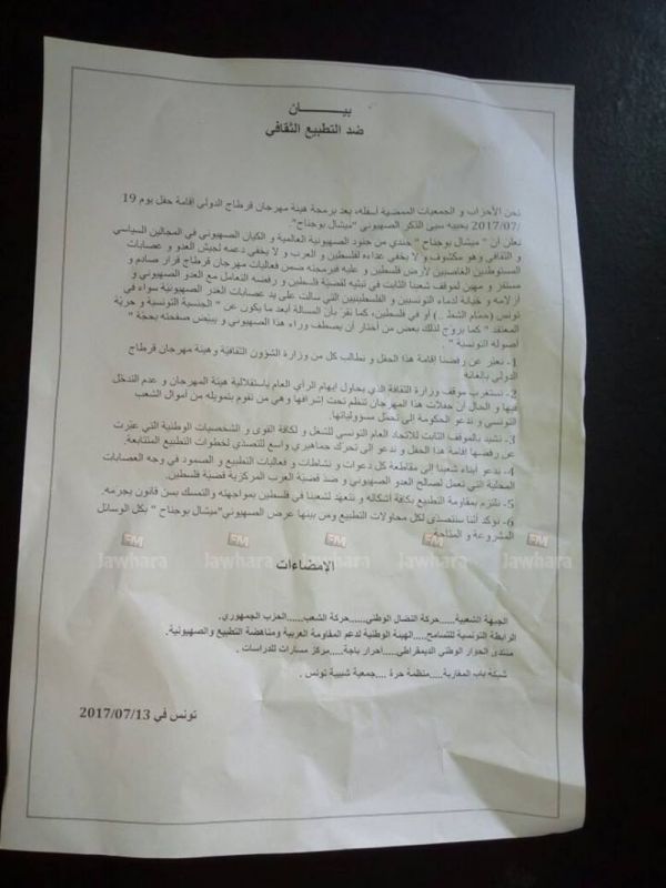 وقد شارك في هذا التحرك كل من أحزاب الجبهة الشعبية والجمهوري وحركة الشعب و حركة النضال الوطني، وكذلك الرابطة التونسية للتسامح والهيئة الوطنية لدعم المقاومة العربية ومناهضة التطبيع والصهيونية.