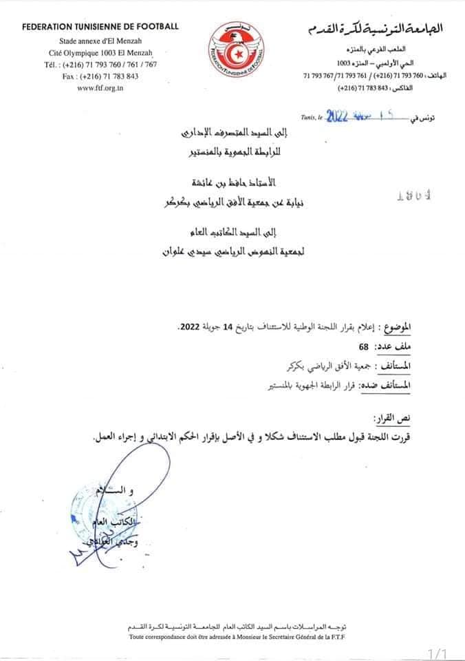 أعلن نادي الأفق الرياضي بكركر اليوم الجمعة 15 جويلية 2022، الالتجاء إلى المحكمة الدولية الرياضية