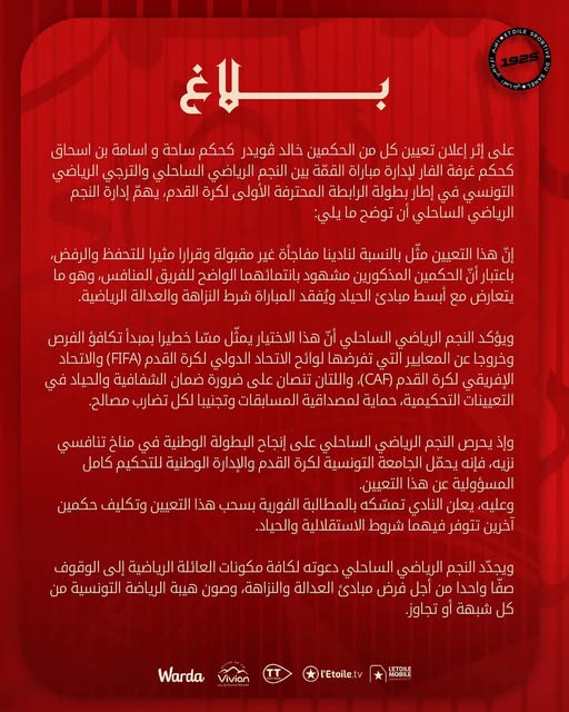 أصدر النجم الرياضي الساحلي بلاغًا عبر صفحته الرسمية، أعلن فيه رفضه تعيين الحكم خالد ڨويدر كحكم ساحة وأسامة بن إسحاق كحكم غرفة “الفار” في مباراة القمة أمام الترجي الرياضي التونسي الأحد القادم في إطار الجولة 9 لبطولة الرابطة المحترفة الأولى معتبرًا أن هذا التعيين يمسّ بمبدأ الحياد وتكافؤ الفرص، ومطالبًا الجامعة التونسية لكرة القدم بسحبه فورًا وتعيين طاقم تحكيم آخر تتوفّر فيه شروط النزاهة والعدالة الرياضية .