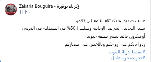 وقال في تدوينة نشرها على صفحته بالفايسبوك " أوميكرون قاعد ينتشر بصفة جنونية..ردوا بالكم على رواحكم وبالأخص على صغاركم".