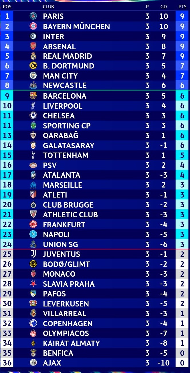 ترتيب دوري أبطال أوروبا بعد الجولة الثالثة