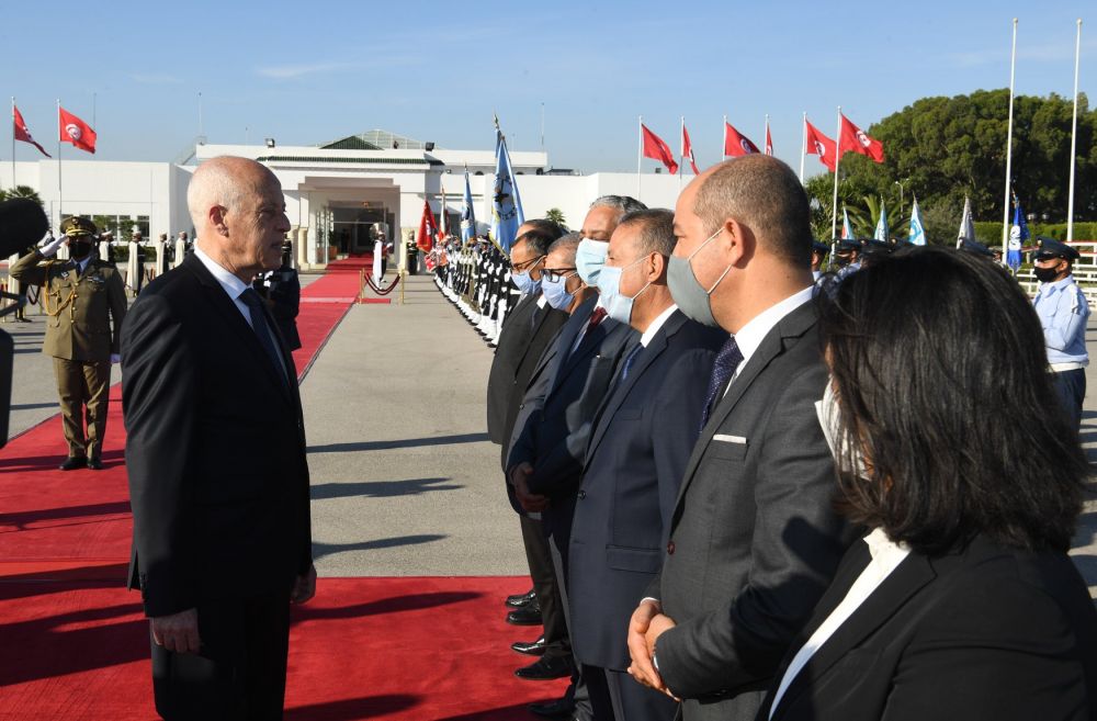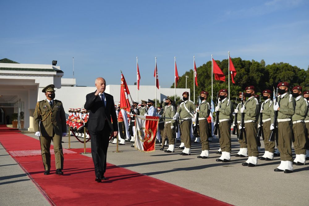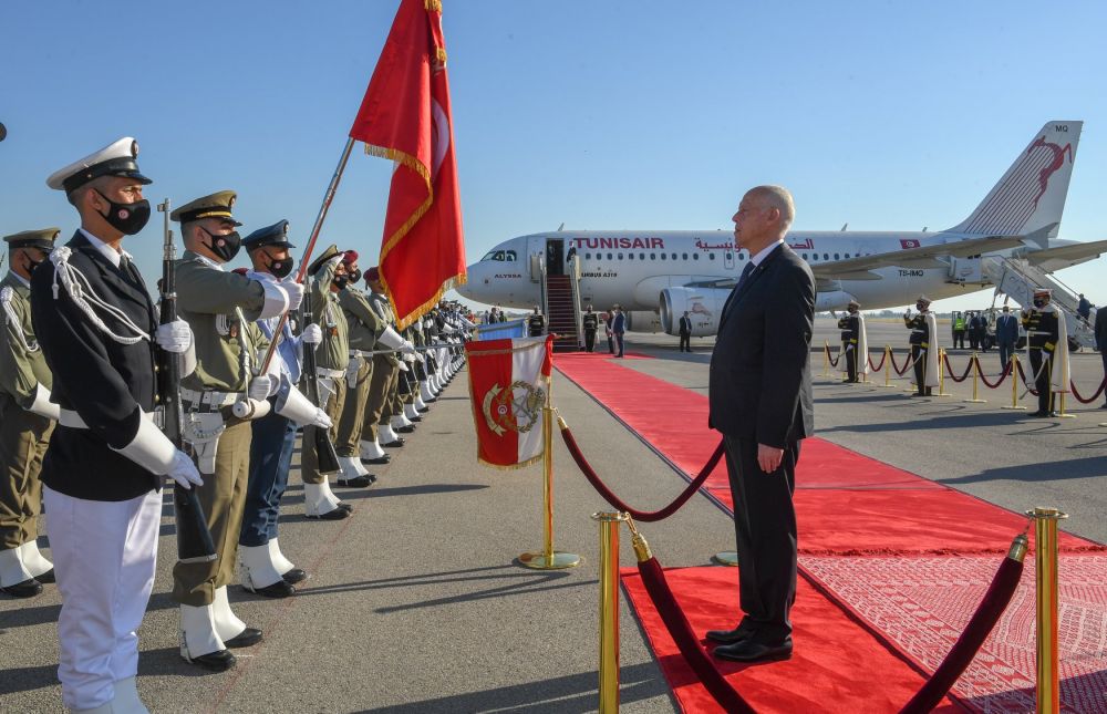 ولدى حلوله بمطار تونس قرطاج الدولي استعرض رئيس الدولة تشكيلة من الجيوش الثلاثة أدت له التحية، قبل تحية العلم على أنغام النشيد الوطني.