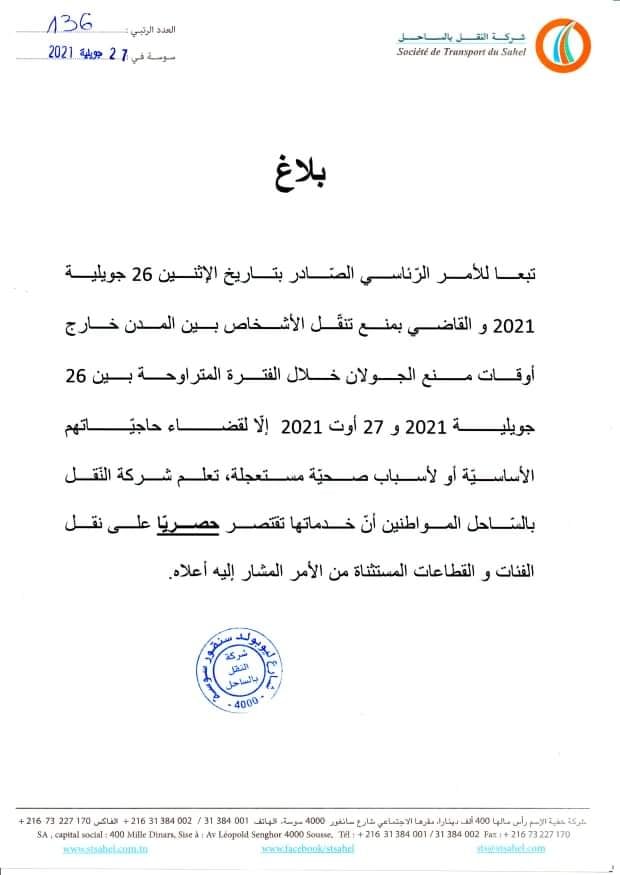 أعلنت شركة النقل بالساحل في بلاغ لها أنه تبعا للأمر الرئاسي القاضي بمنع جولان الأشخاص والعربات بكامل تراب الجمهورية من الساعة السابعة مساء إلى الساعة السادسة صباحا ،فسيتم الإقتصار فقط على نقل الفئات المستثناة من هذا القرار.