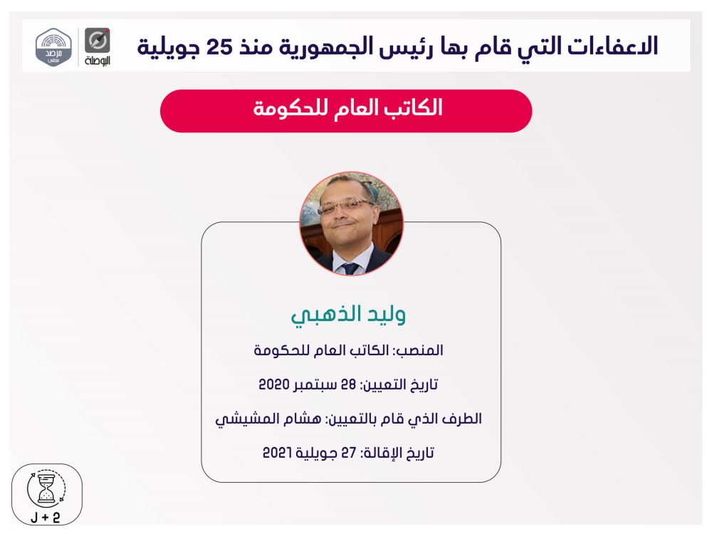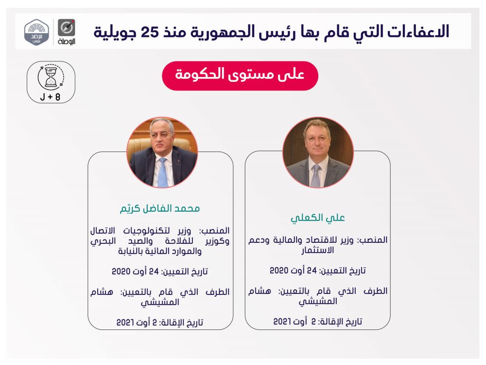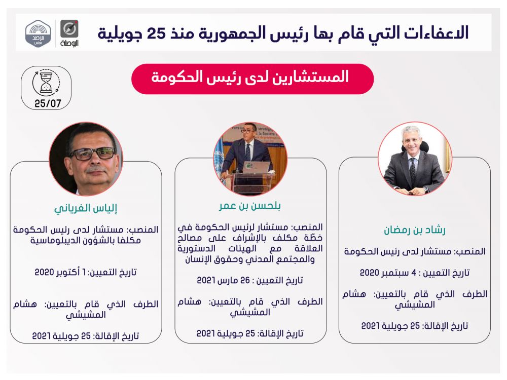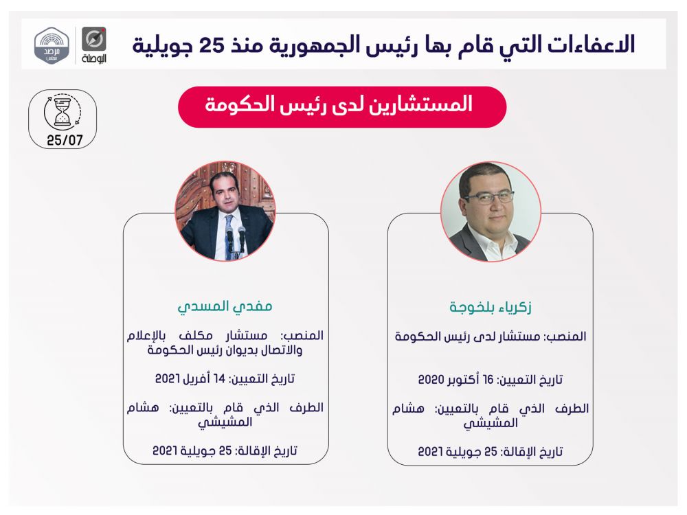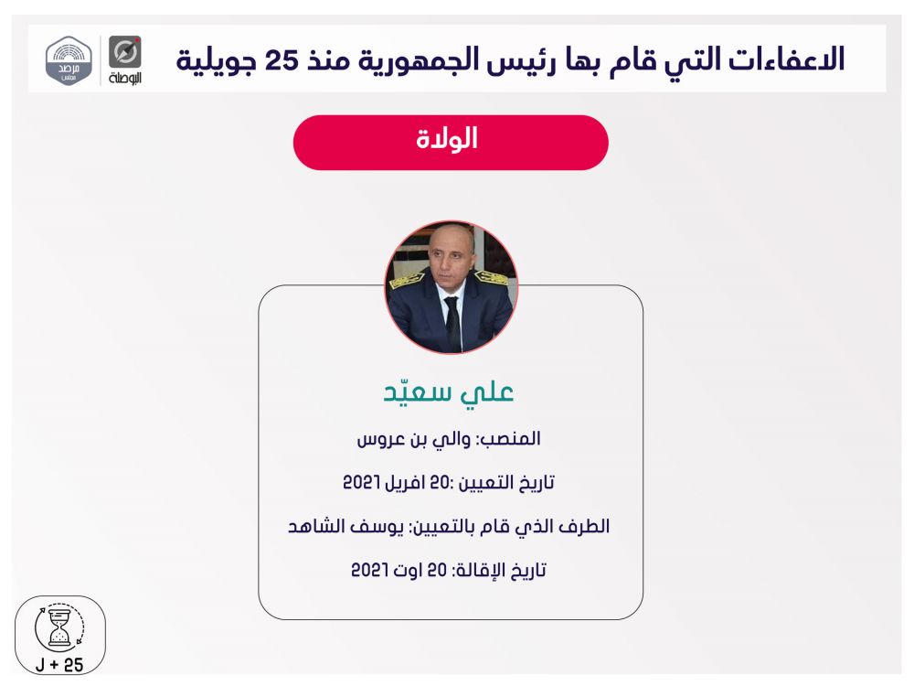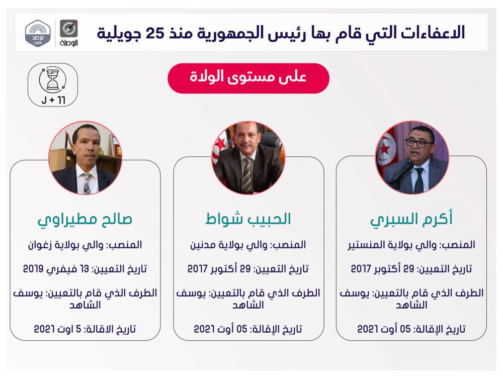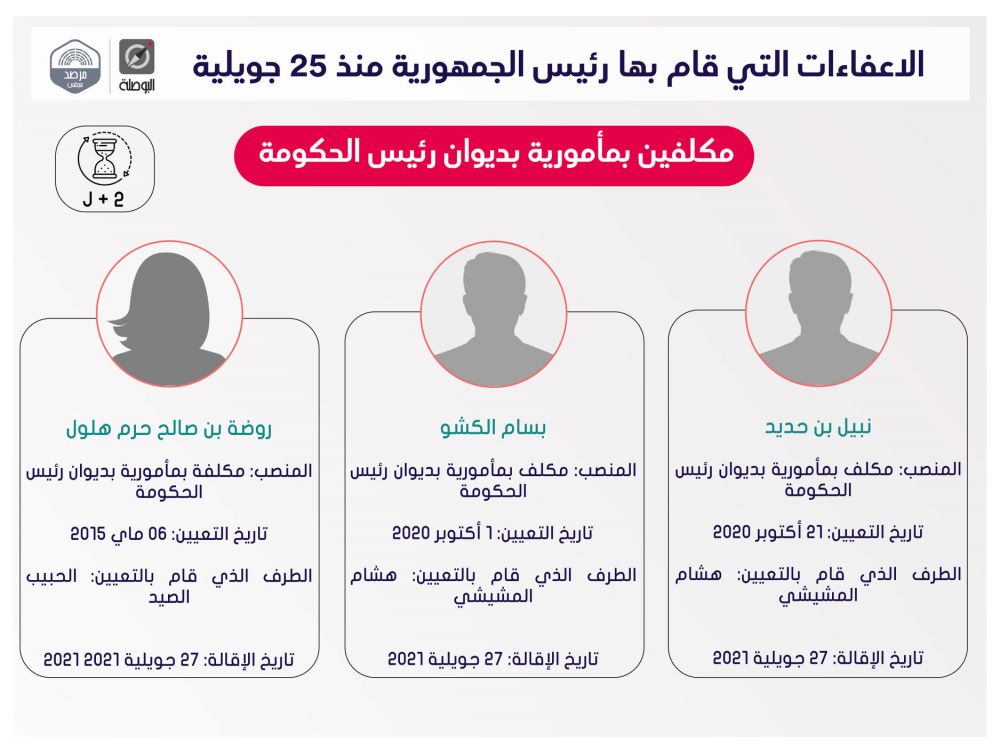 نشرت منظمة بوصلة اليوم الثلاثاء، ملخصا لقرارات إعفاء مسؤولين حكوميين وولاّة وغيرهم، اتخذها رئيس الجمهورية قيس سعيد، منذ إعلان التدابير الاستثنائية في 25 جويلية الماضي، ضمت قائمة اسمية محيّنة، إلى حدّ اليوم.