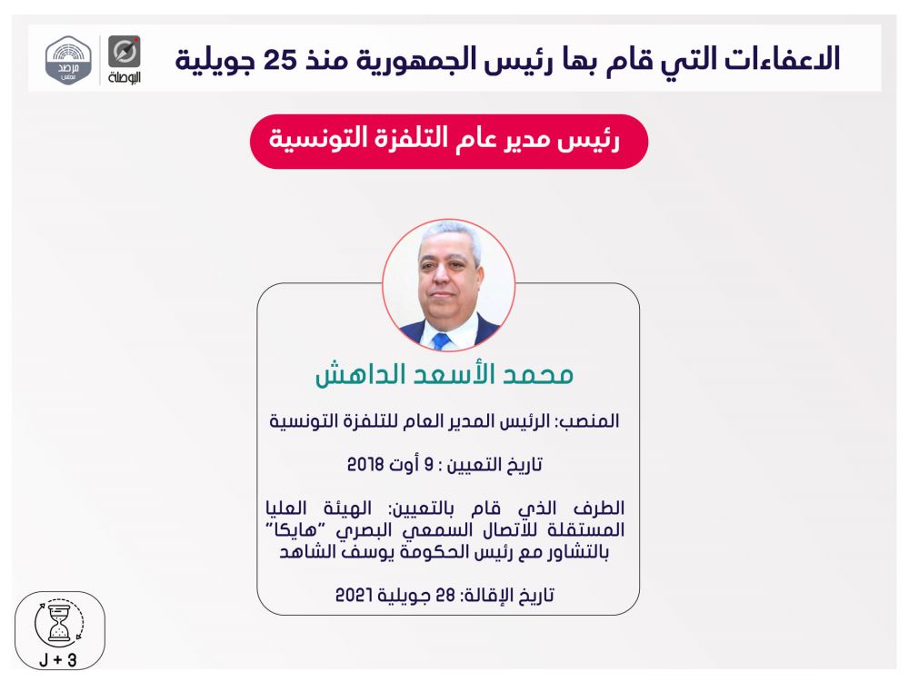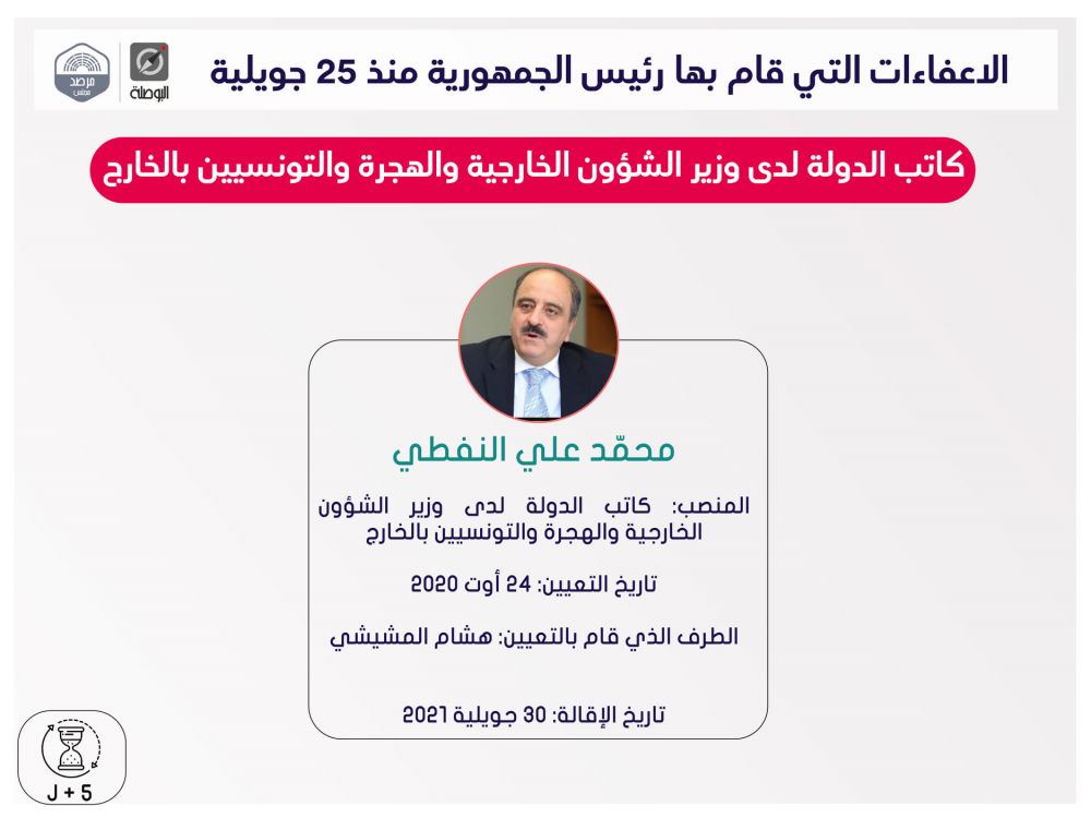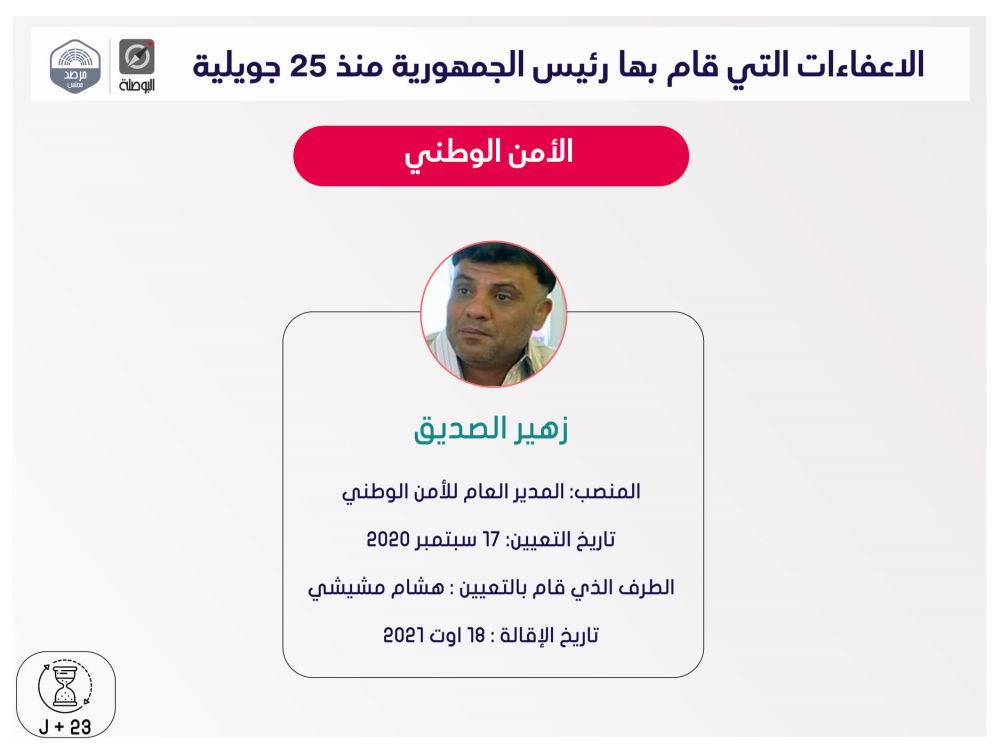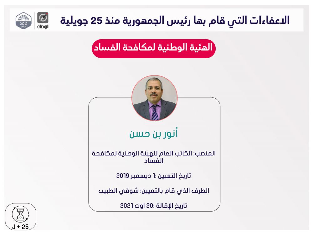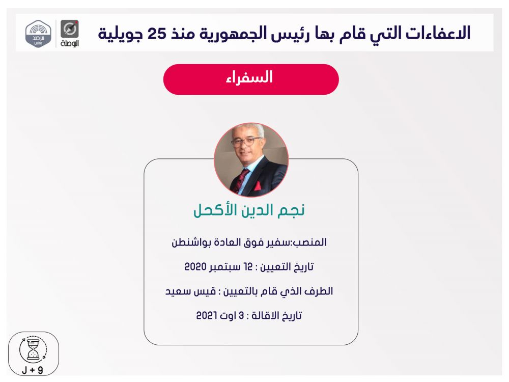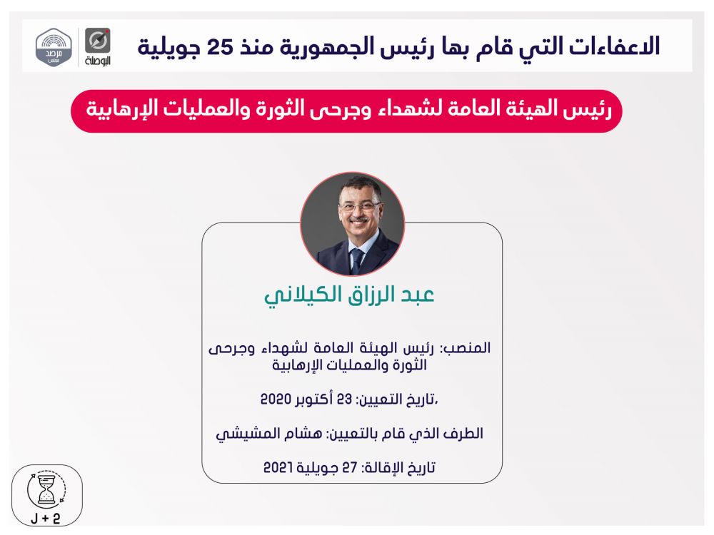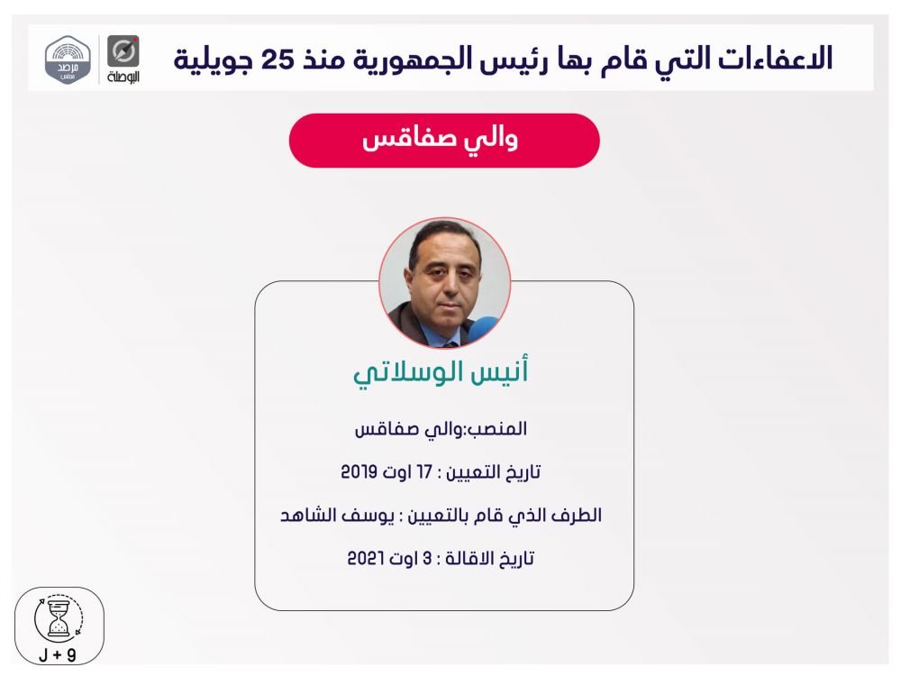 نشرت منظمة بوصلة اليوم الثلاثاء، ملخصا لقرارات إعفاء مسؤولين حكوميين وولاّة وغيرهم، اتخذها رئيس الجمهورية قيس سعيد، منذ إعلان التدابير الاستثنائية في 25 جويلية الماضي، ضمت قائمة اسمية محيّنة، إلى حدّ اليوم.