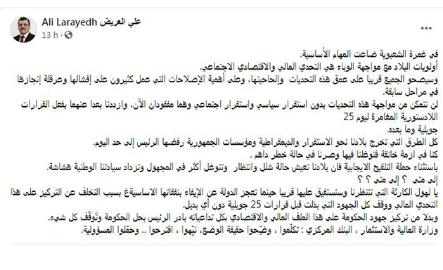 ونبّه العريّض في تدوينة نشرها على صفحته الرسمية بالفايسبوك من"هول الكارثة التي وستستفيق عليها البلاد قريبا حين تعجز الدولة عن الإيفاء بنفقاتها الأساسية بسبب التخلف عن التركيز على هذا التحدي المالي ووقف كل الجهود التي بُذلت قبل قرارات 25 جويلية دون أي بديل" وفق قوله.