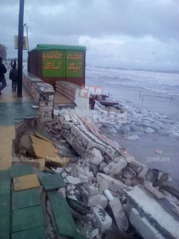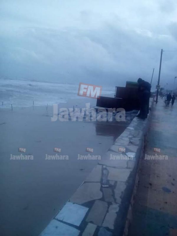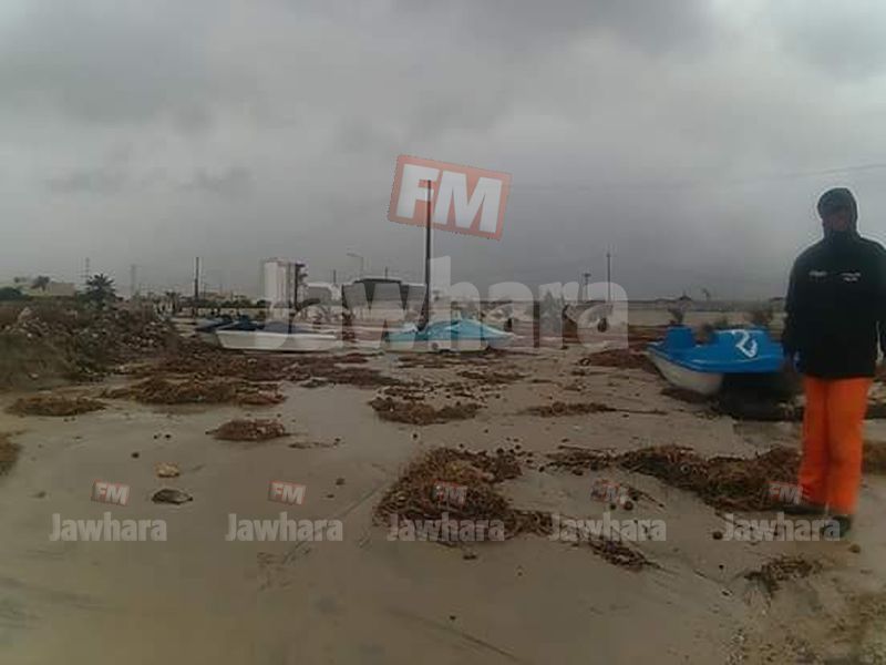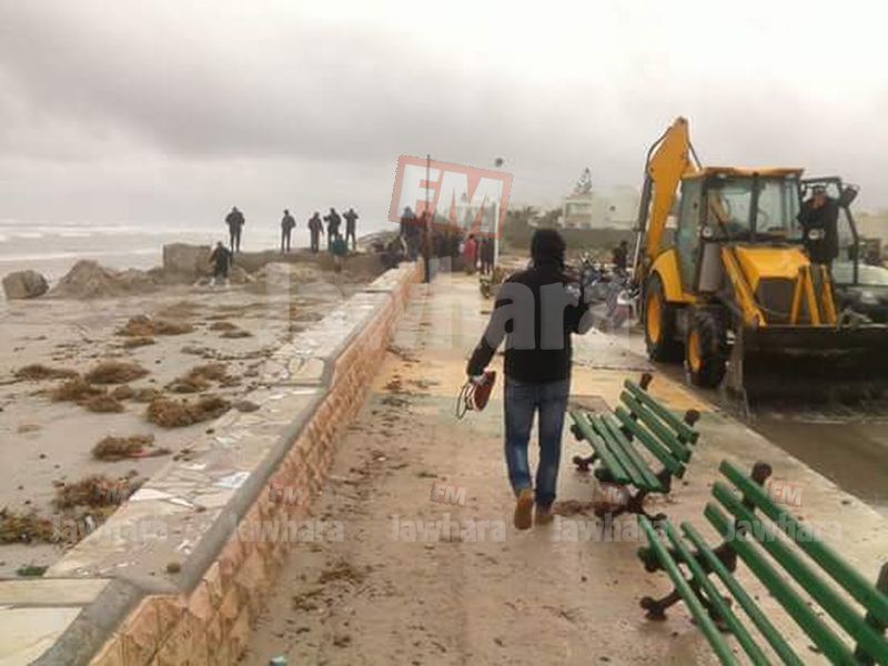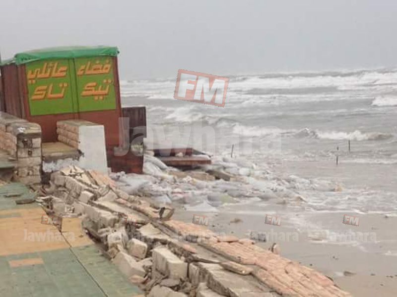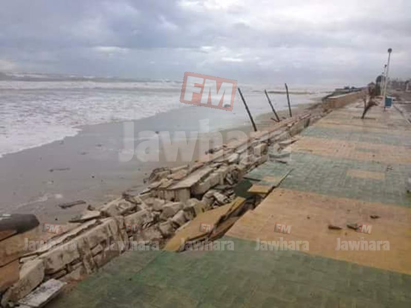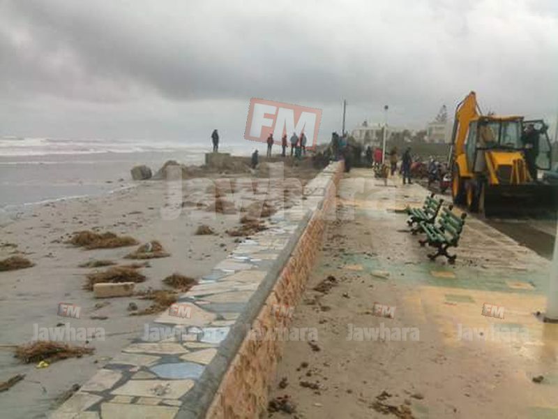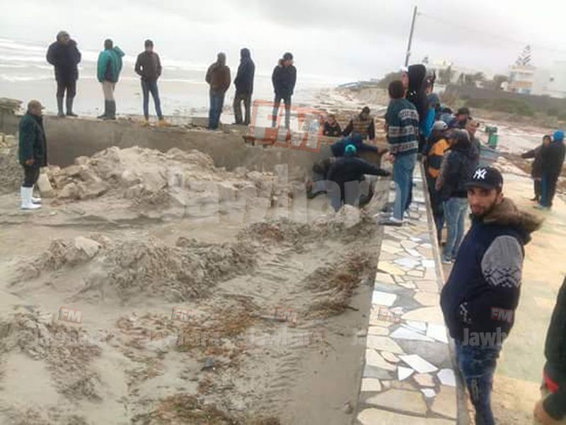 شهدت الرجيش من ولاية المهدية اليوم الأحد عاصفة عنيفة تسببت في هيجان البحر ونزول كميات كبيرة من الأمطار ما أدى إلى سقوط جزء من سور الفسحة الشاطئية.