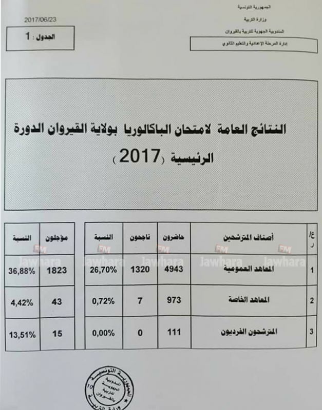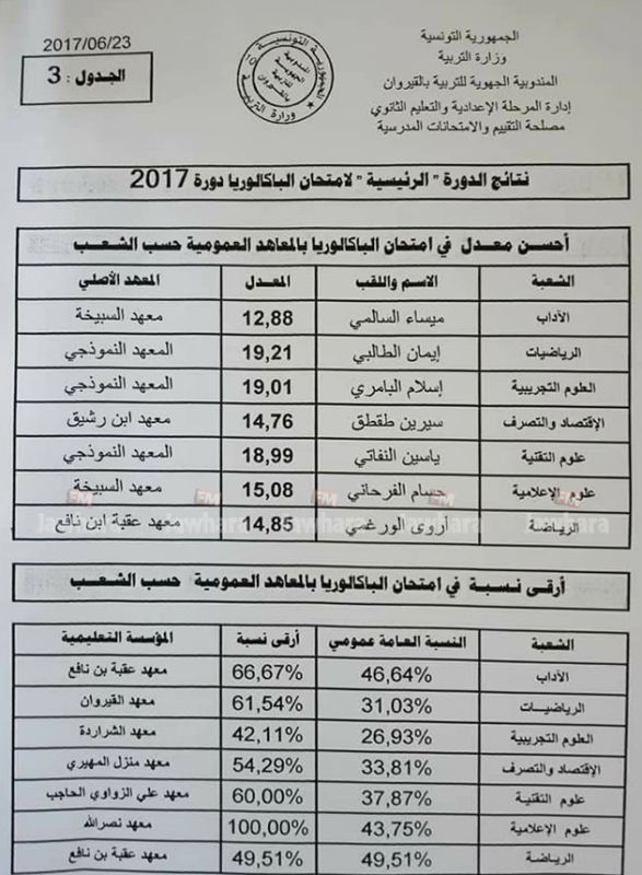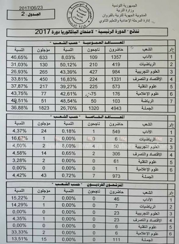 أكد المندوب الجهوي للتربية بالقيروان عبد السلام غنام في مداخلة له في صباح الورد صباح اليوم الجمعة 23 جوان 2017 أن نسبة النجاح العامة في الدورة الرئيسية لامتحان الباكالوريا أن نسبة النجاح في المعاهد العمومية بلغت 26.7 بالمائة.