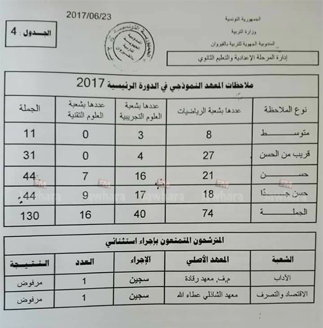 وأشار إلى أن عدد المترشحين عن المعاهد الخاصة بلغ 973 مترشحا لم ينجح منهم سوى 7 مترشحين أي بنسبة 0.72 بالمائة في ما تأجل 43 تلميذا.