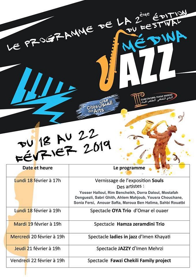 في إطار البرنامج الوطني "مدن الفنون" ينظم النادي الثقافي الطاهر الحداد الدورة الثانية لتظاهرة "مدينة جاز" "Festival Médina Jazz" وذلك في الفترة الفاصلة بين 18 و22 فيفري 2019.