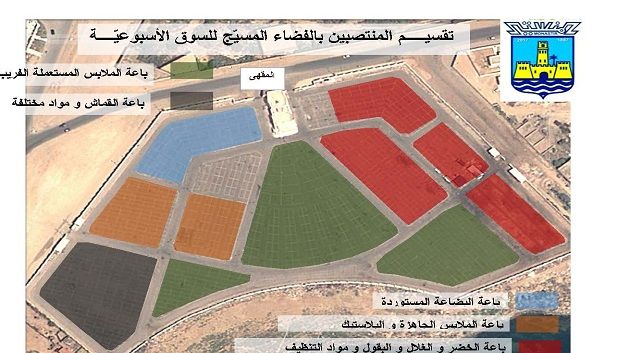 ونشرت البلدية على صفحتها الرسمية صورة لمثال تقسيم المنتصبين بالفضاء المسيج للسوق الأسبوعية، والذي شمل مساحة لتجار البضاعة المستوردة، ومساحة لباعة الملابس الجاهزة والبلاستيك وأخرى لتجار القماش ومواد مختلفة، في حين خصصت 3 مساحات لباعة الملابس المستعملة تقريبا جميعها وسط السوق و4 مساحات لباعة الخضر والغلال والبقول ومواد التنظيف.