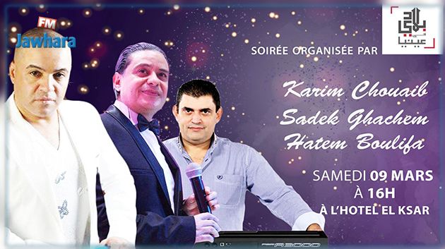 تنظم جمعية "بلادي في عينيا" برعاية الجوهرة أف أم حفلا موسيقيا يوم السبت 9 مارس 2019 بداية من الساعة الرابعة زوالا بنزل القصر بسوسة يحييه كل من كريم شعيب والصادق غشام وحاتم بوليفة.
