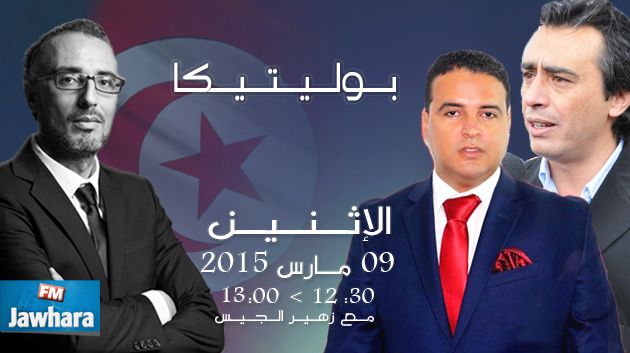 يستضيف برنامج بوليتيكا الاثنين 09 مارس 2015 رئيس شبكة دستورنا جوهر بن مبارك و معز بن نصرعضو المكتب التنفيذي للحركة الدستورية ابتداء من الساعة 12:30