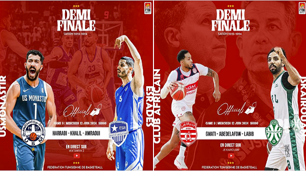 تدور اليوم الاربعاء 12 جوان مباريات الجولة الثالثة من سلسلة نصف نهائي بطولة كرة السلة وفق البرنامج التالي :