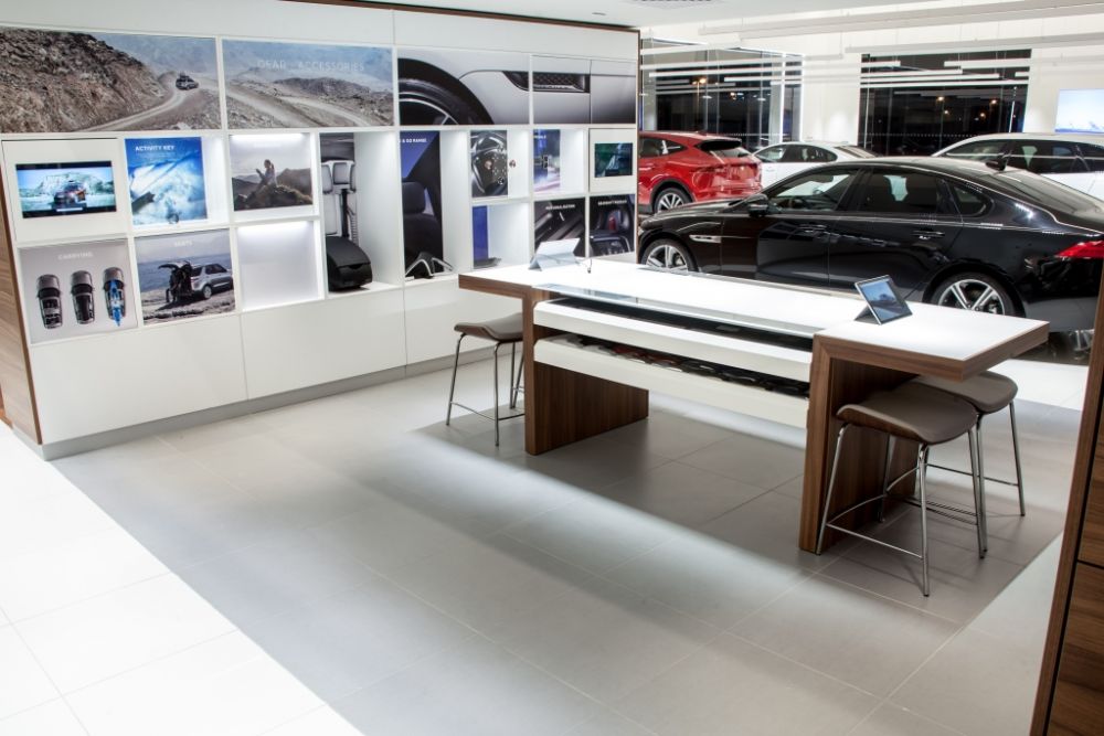 Le showroom est divisé en deux parties symétriques Jaguar et Land Rover avec un total de 16 baies d’exposition accueillant la gamme complète pour ces 2 marques Premium.
