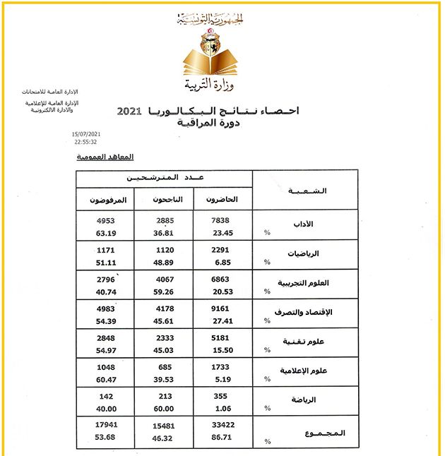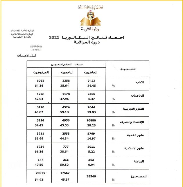 Accueil >Actualité >Tunisie Tunisie16/07/2021 à 10:02 Tweeter Bac 2021 : Les résultats de la session de contrôle publiés Le ministère de l'Education a publié ce vendredi matin les résultats de la session de contrôle de l'examen du Baccalauréat 2021 ainsi que les taux de réussite de chaque section.