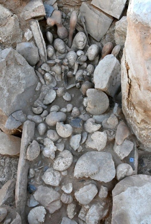 A l’arrière des deux pierres dressées, un dépôt structuré a été identifié. Il était composé de près de 150 fossiles marins dont de nombreux étaient soigneusement agencés, fichés verticalement suivant une orientation spécifique, aux côtés d’une variété de pierres naturelles aux formes inhabituelles, ainsi que d’un certain nombre d’artefacts travaillés peu courants, incluant notamment des figurines animales et des objets en silex hors normes.