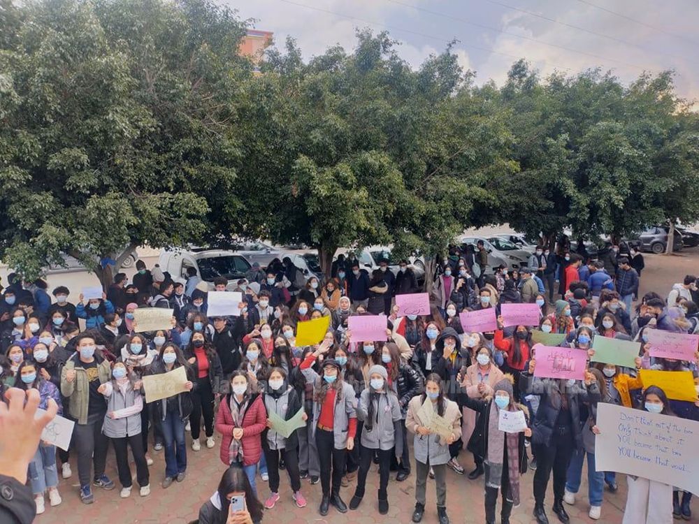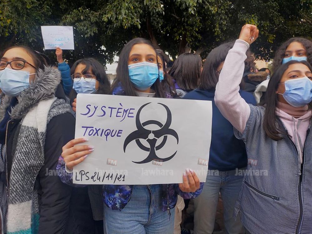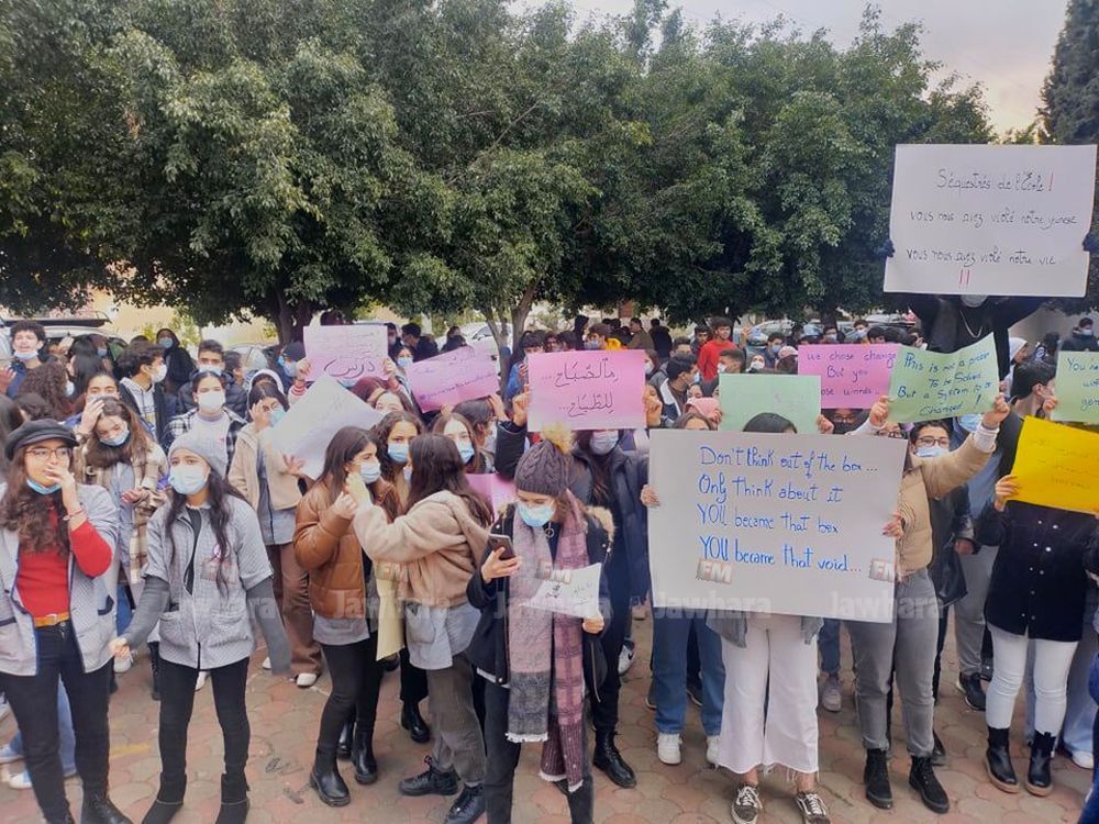 Des élèves du lycée pilote de Sousse ont observé ce jeudi 13 janvier 2022 un rassemblement protestataire devant l'établissement éducatif pour revendiquer la mise en place d'un système semestriel et de mesures spéciales pour lutter contre la propagation du Coronavirus.
