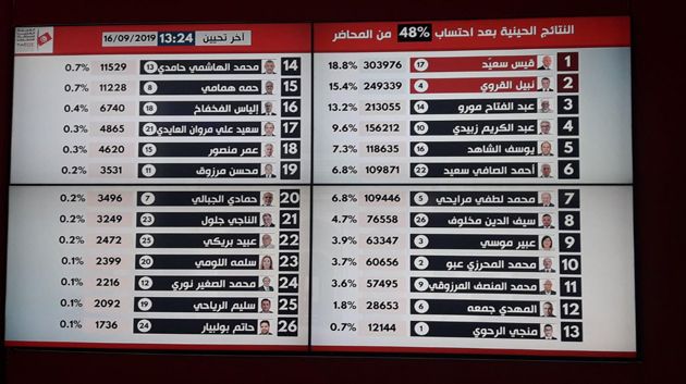 Le candidat indépendant Kaïs Saied reste en tête du classement avec 18,8% des voix, d'après les résultats du comptage de 48% des PV de dépouillement, annoncés par l'ISIE.