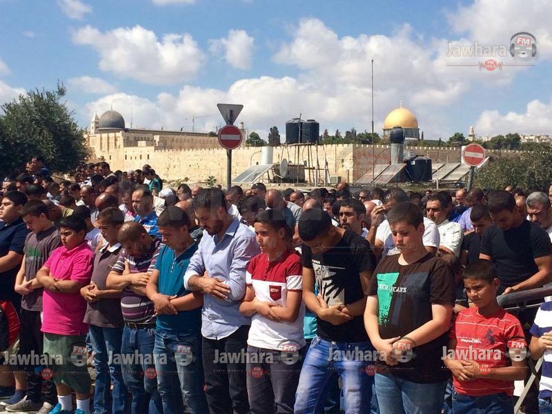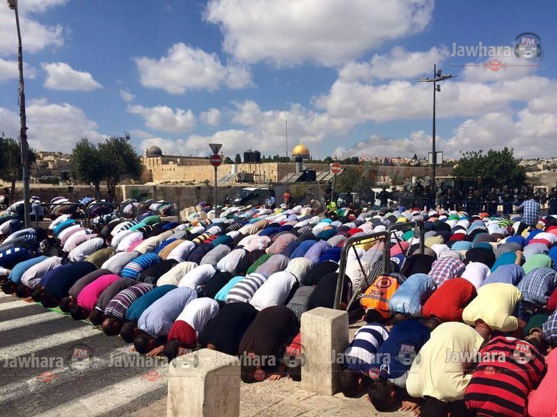Des palestiniens font la prière dans les rues après leur empêchement d'accéder à la mosquée Al Aqsa