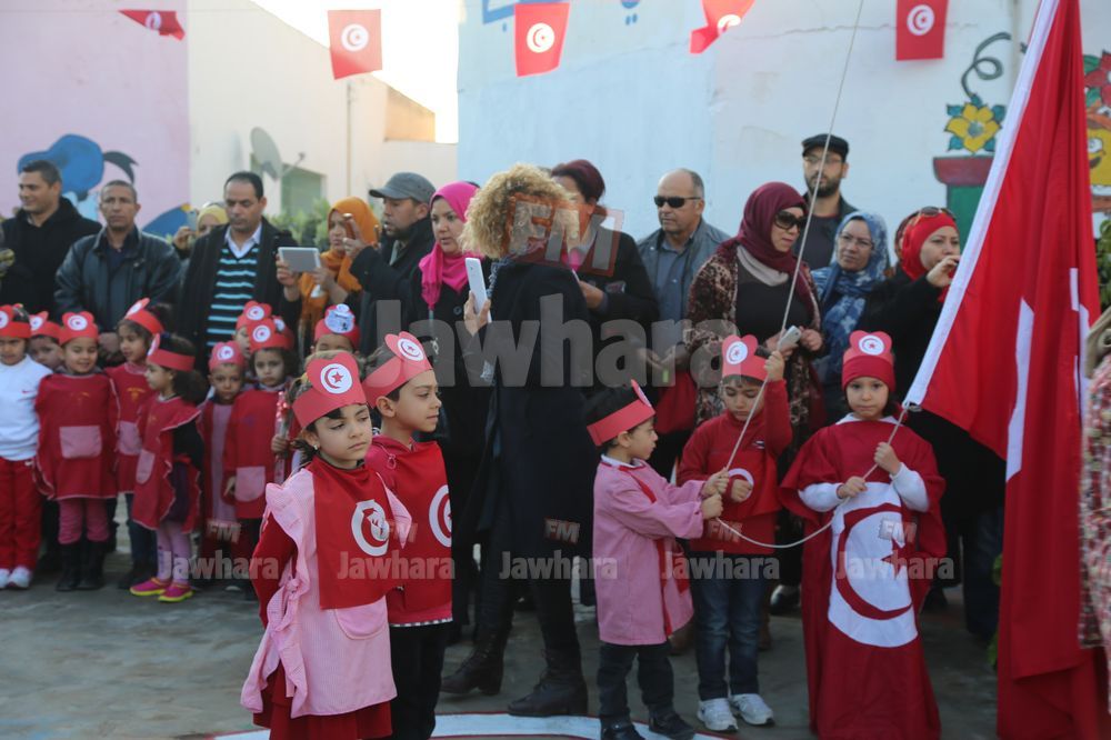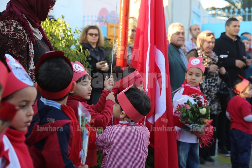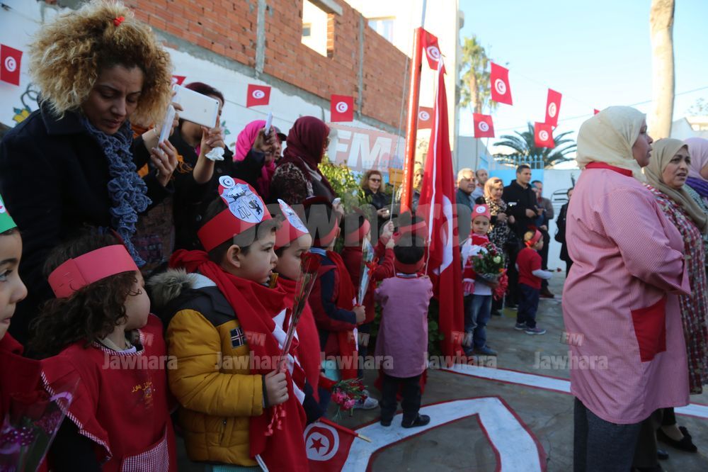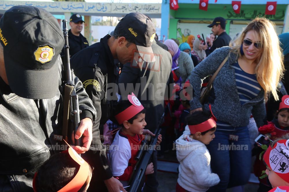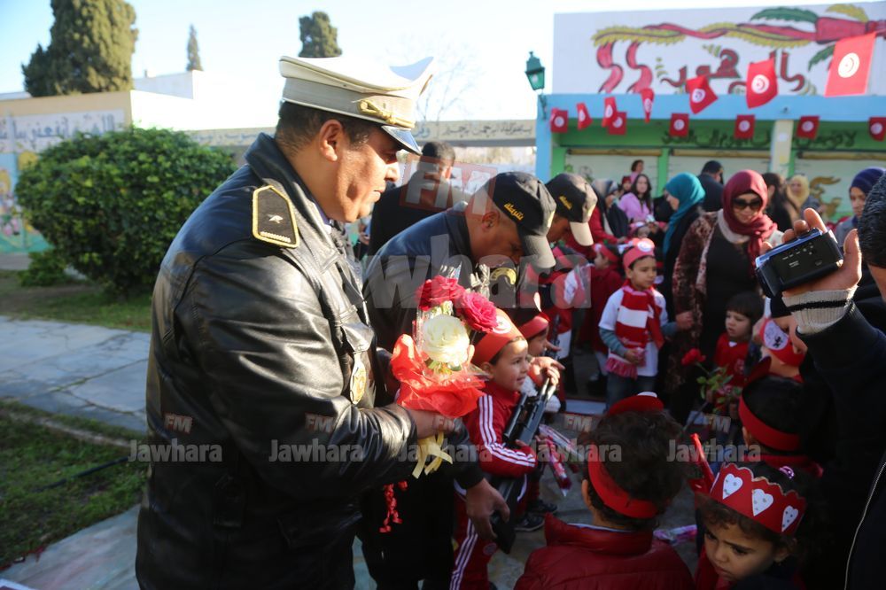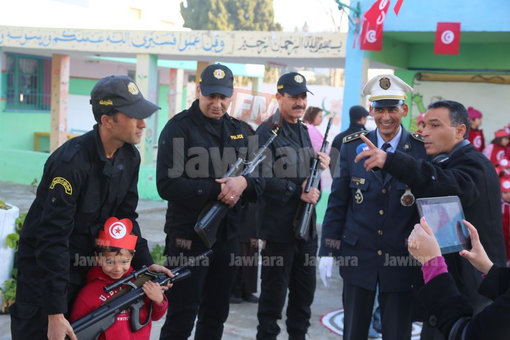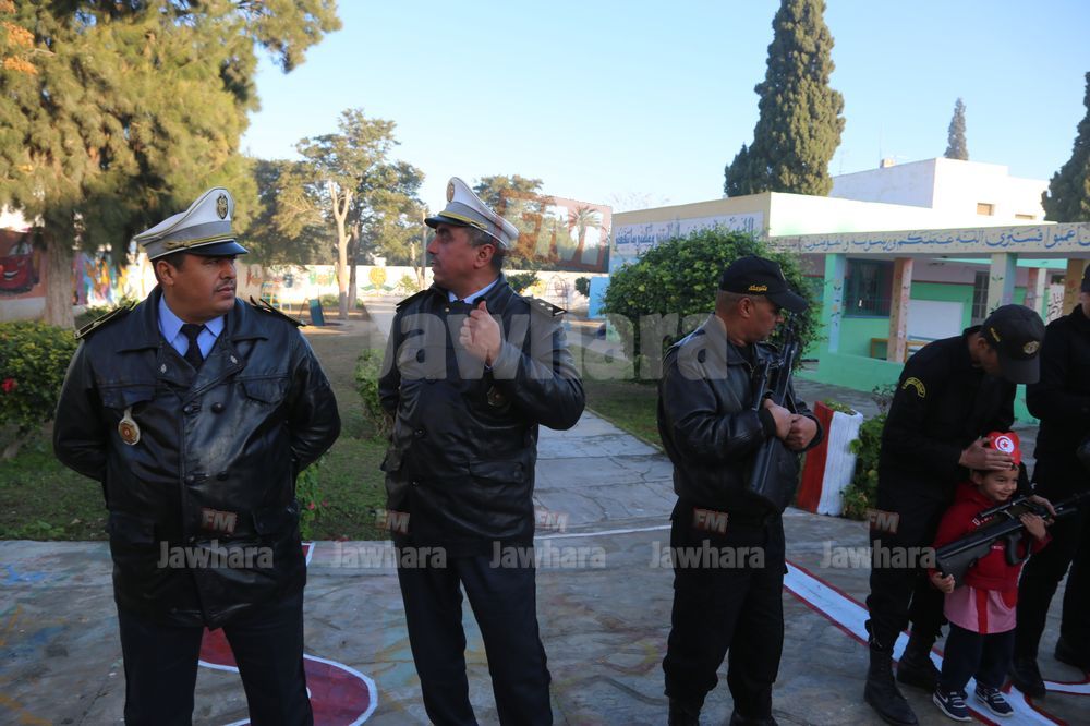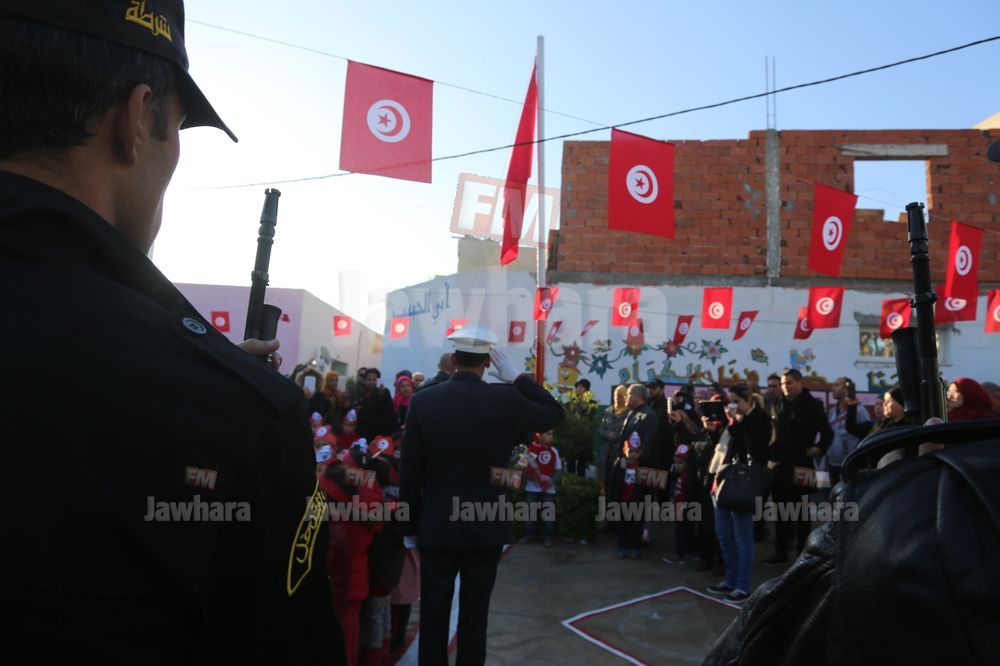 Salut du drapeau dans un jardin d'enfants à Bouhsina avec les forces de police et de la garde nationale